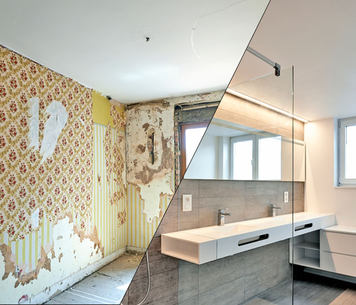 Split image of a bathroom showing a worn-down wall with peeling wallpaper on the left and a modern, renovated bathroom on the right.