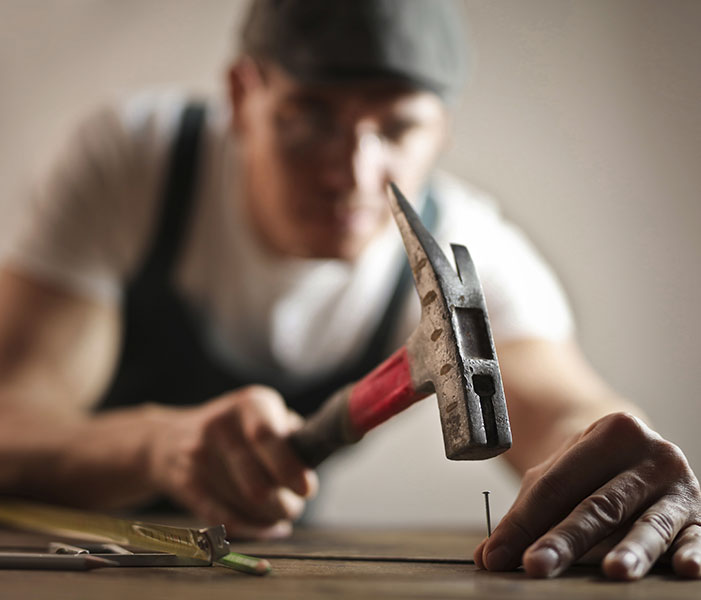 Person hammering a nail into a surface, focusing intently on the task. Various tools are visible nearby.