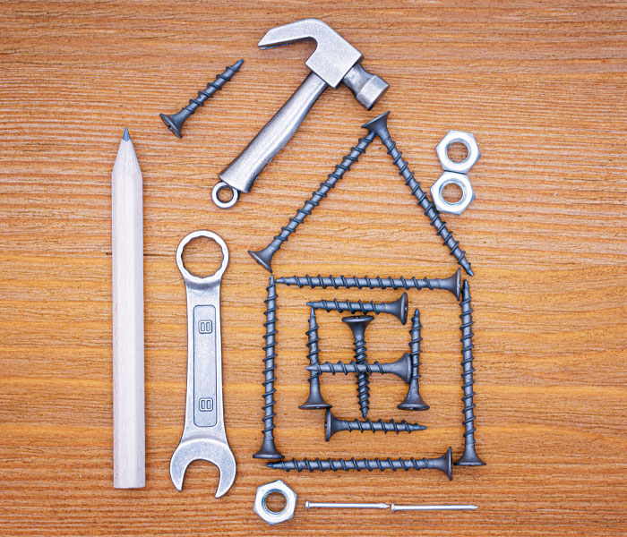 A hammer, pencil, wrench, nuts, nails, and screws arranged on a wooden surface to form a house shape.