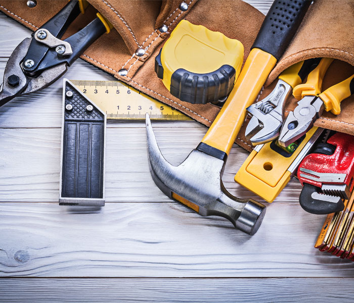 Assorted hand tools, including a hammer, pliers, and measuring tape, arranged on a wooden surface next to a leather tool belt.